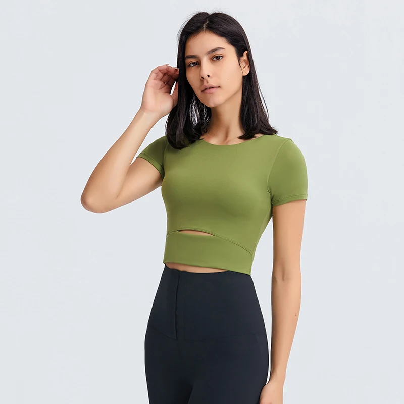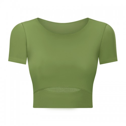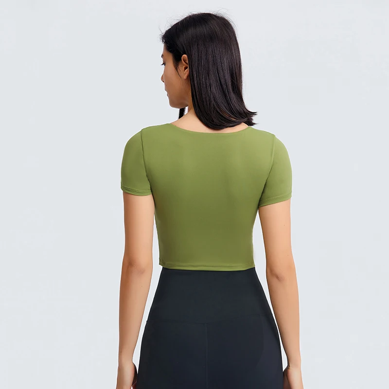New Slim Running Fitness Women Rib Crop Size Short Shirt Sleeve Clothes Cotton Yoga-Green