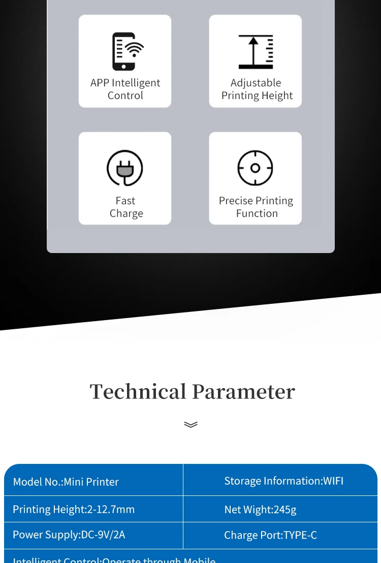 Mobile controlled operating system brings great convenience for editing and operating,any information edit on mobile and any logo&pictures in mobile can be directly uploaded to mini printer and printed out meanwhile.