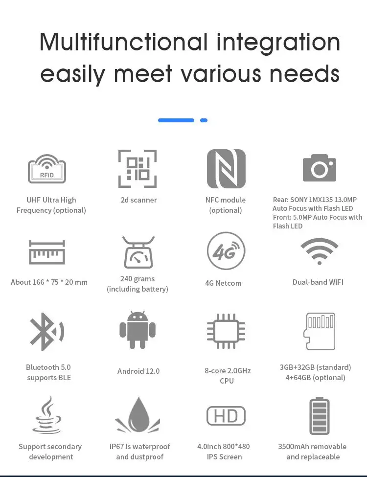 1.Android 12.0 device with 4G,wifi ,NFC,GPS, Blue tooth 5.0, 13MP camera and 2D scanner( optional)