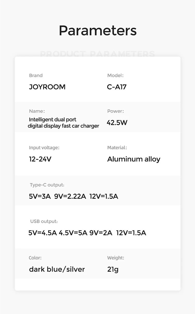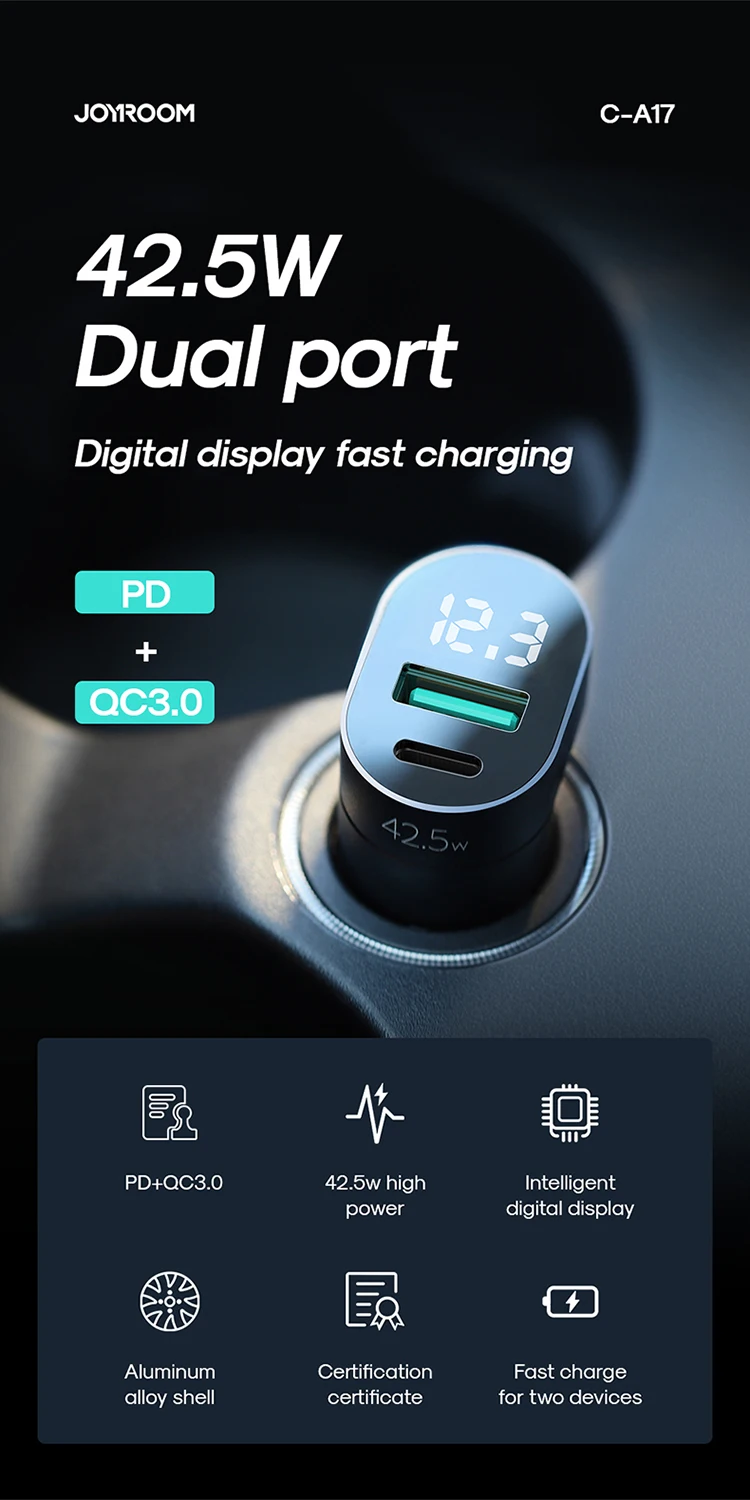 Joyroom C-A17 48W Intelligent 2-port LED Fast Car Charger Silver Dual port output for mobile phone