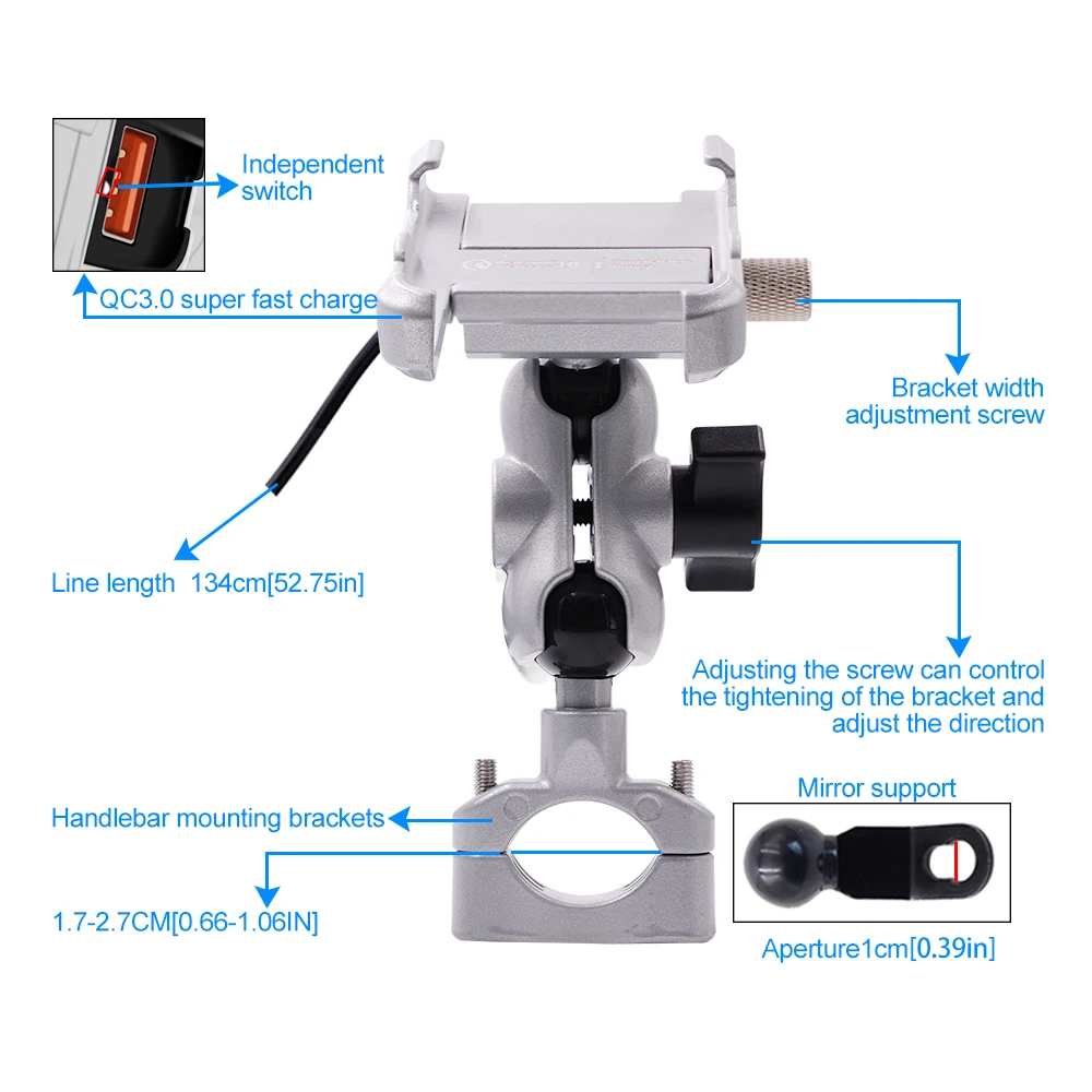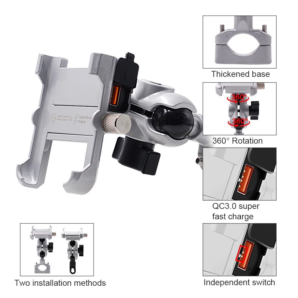 Motorcycle aluminum alloy charging mobile phone holder QC3.0 intelligent fast charging universal rotatable waterproof navigation